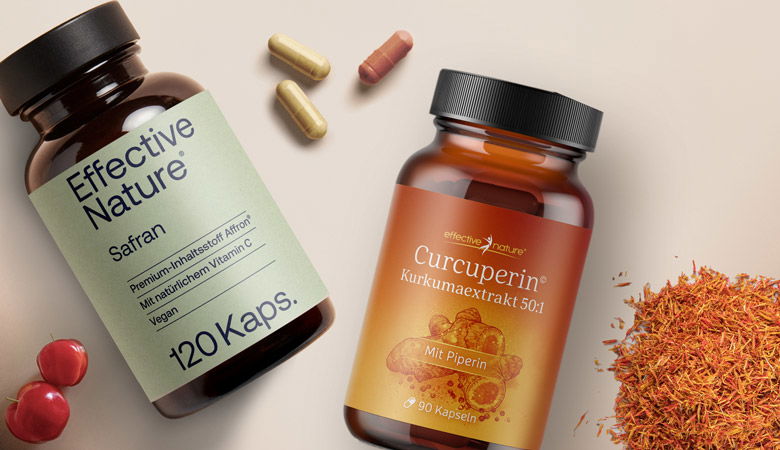 Die beiden Kapseln mit Safran- und Kurkuma-Extrakt enthalten hochkonzentrierte Extrakte der Gewürze. Diese sind auf den jeweiligen Inhaltsstoff von Interesse standardisiert und viel wirkungsvoller als die Gewürze selbst. So genügen wenige Kapseln pro Tag, die zudem sehr praktisch und überall eingenommen werden können.