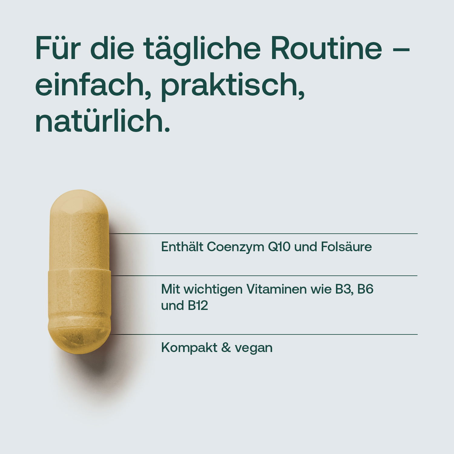 Qualität und Verarbeitung gut, Kombi mit Q10, B-Vitaminen und Folsäure sehr gut, bekömmlich. Aber Menge zu gering , 90 Kapseln, bei 4 Kapseln/Tag, reichen ja nicht einmal für einen Monat! Oder die Dosierung/Kapsel erhöhen.