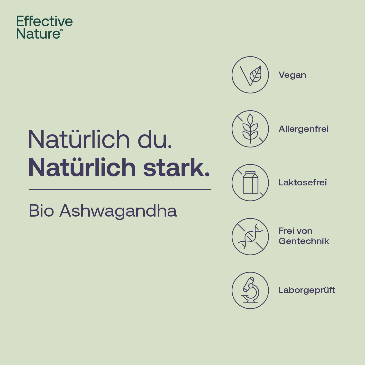 Ashwagandha, auch bekannt unter weiteren Namen wie Schlafbeere, Indischer Ginseng oder Winterkirsche, ist eine beliebte Pflanze aus der ayurvedischen Tradition - sie wird seit Jahrtausenden in Indien angepflanzt und genutzt. Heute wird sie wegen ihren wertvollen, adaptogenen Eigenschaften weltweit geschätzt und verwendet. effective nature verarbeitet den speziell hochwertigen Bio-Extrakt KSM-66 Ashwagandha®, der in Indien - Heimat des Ayurvedas - traditionell aus der Ashwagandha Wurzel hergestellt wird. Er enthält alle einzigartigen sekundären Pflanzenstoffe, insbesondere auch die sog. Withanolide. Ebendiese sind durch ihren Zusammenhang mit den adaptogenen Eigenschaften der Ashwagandha Pflanze bekannt: Sie sollen der ayurvedischen Schlafbeere u.a. eine beruhigende und entspannende Wirkung verleihen - daher rührt auch die deutsche Namensgebung.
