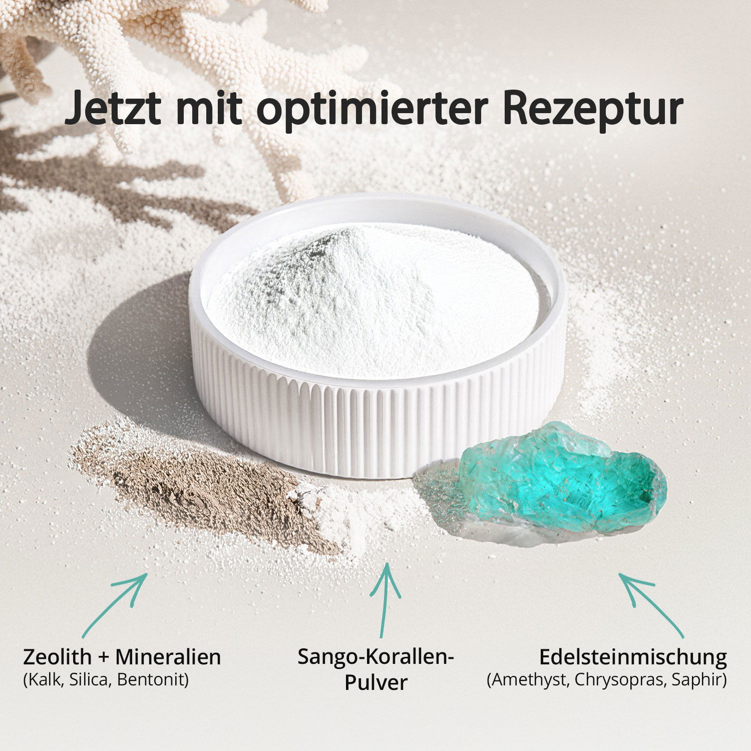 Natriumhydrogencarbonat, Natriumcarbonat, Sango Meereskoralle, Kristallsalz, Kaliumbicarbonat, Magnesiumsulfat, Bentonit, Magnesiumcarbonat, Edelsteinpulver (Bergkristall, Jaspis, Citrin, Rhodochrostit, Calcedon, Lapislazuli, Amethyst)