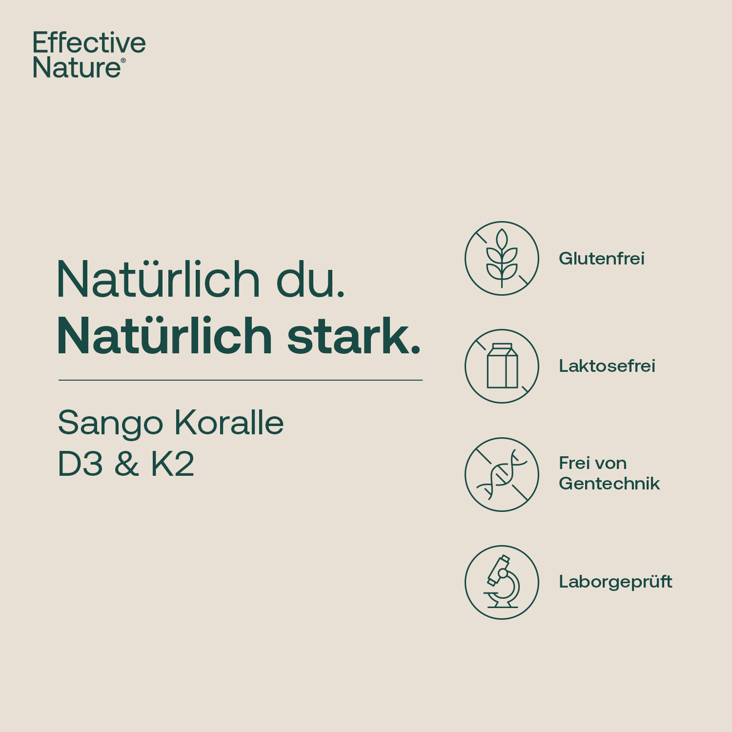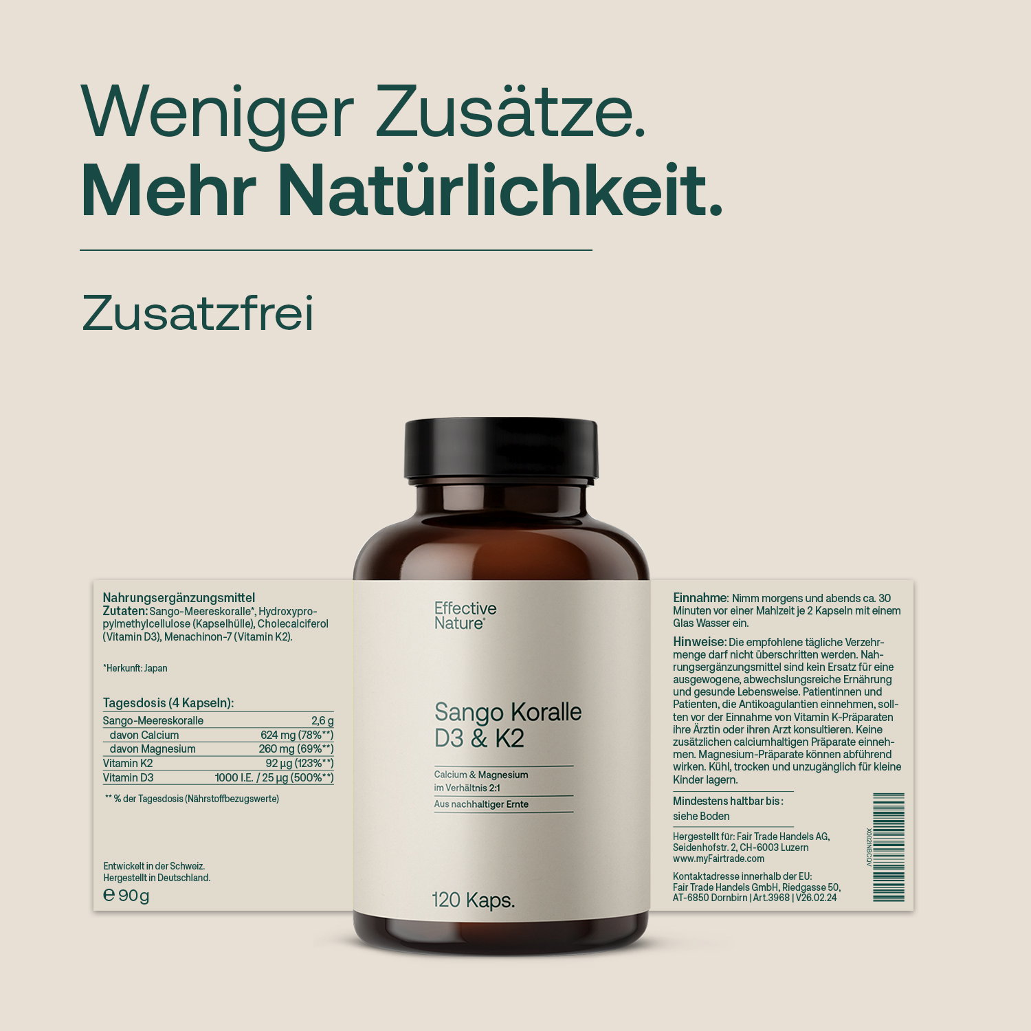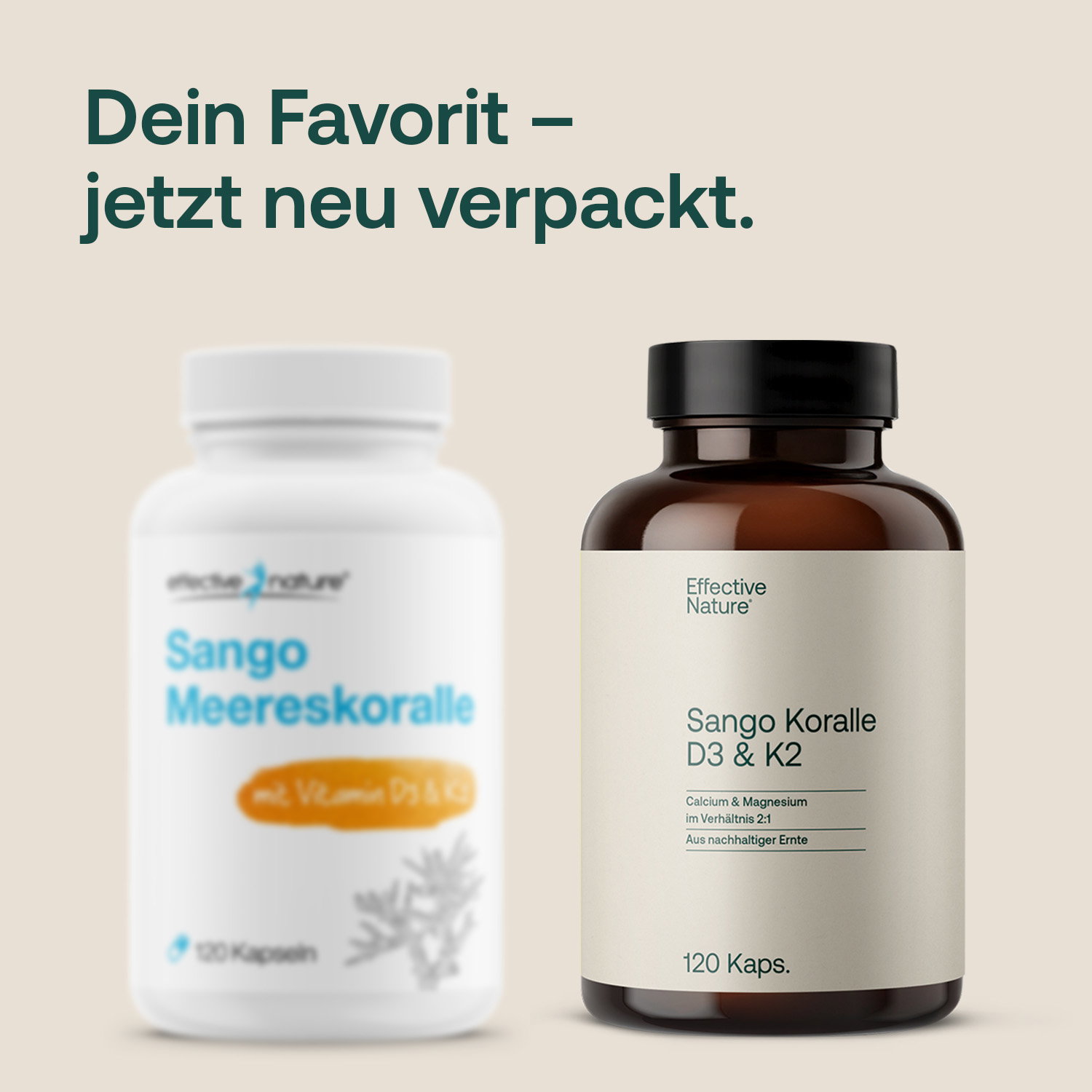 Diese Sango-Kapseln von effective nature enthalten Calcium, Magnesium, Vitamin D3 und Vitamin K2 – also alles wichtige Nährstoffe, die zum normalen Erhalt von Knochen und Zähnen beitragen. Sie stammen aus der sogenannten Sango-Koralle, die an den Küsten Okinawas in Japan heimisch ist.Die enthaltenen Mineralstoffe Calcium und Magnesium liegen dabei in diesem Naturprodukt im idealen Verhältnis zueinander vor.