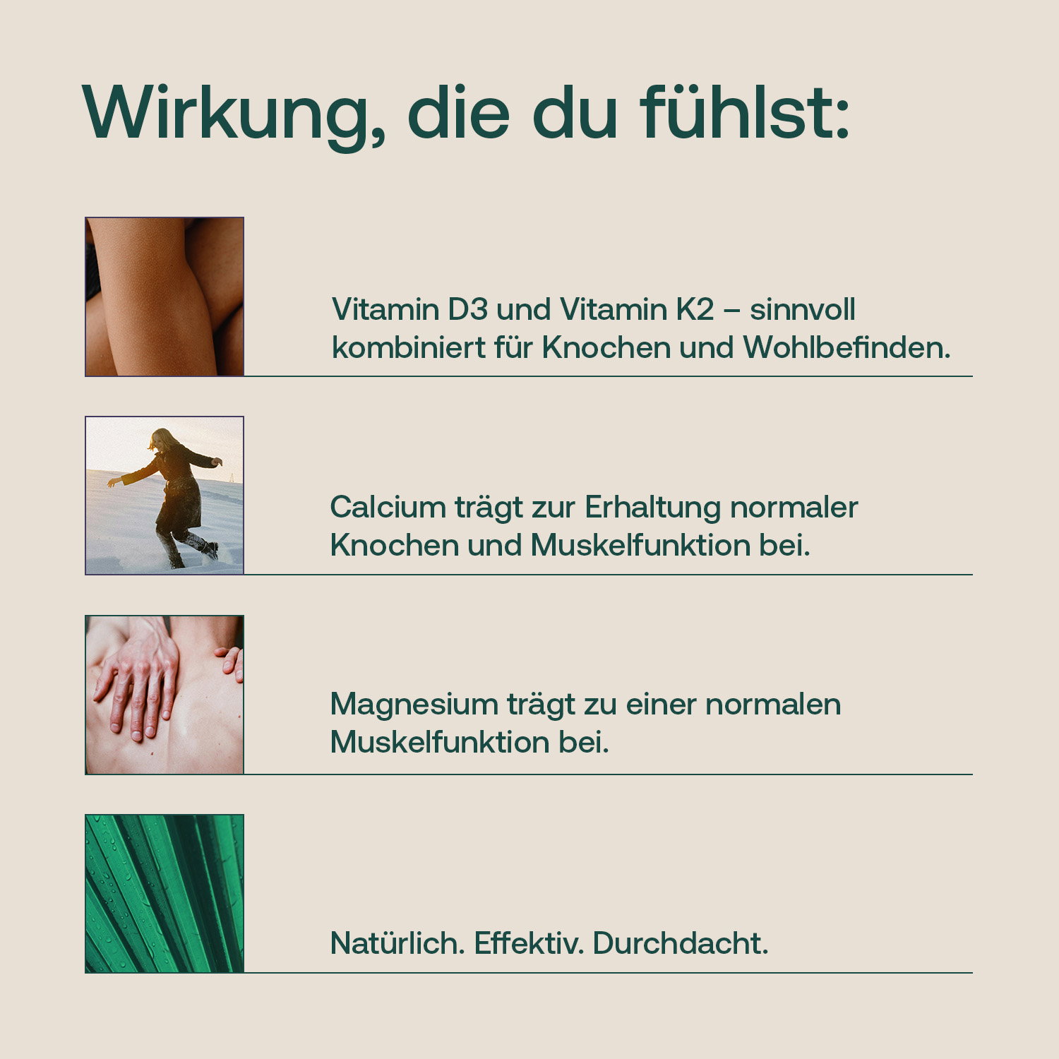 Die Vitamine D3 und K2, von denen Sie mit der empfohlenen Tagesdosis dieser Kapseln problemlos Ihren Tagesbedarf decken, tragen genau wie die beiden Mineralstoffe Calcium und Magnesium zum Erhalt normaler Knochen bei - ein knochenstarker Nährstoffmix!
