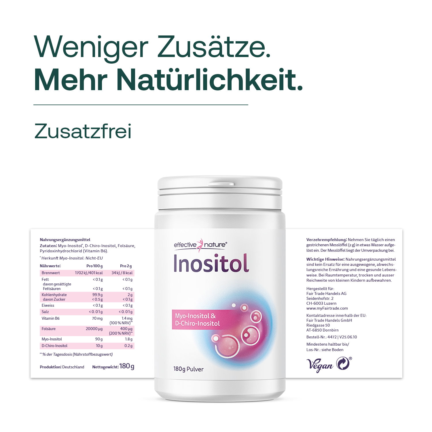 Das Inositol Pure von effective nature enthält ausschliesslich Myo-Inositol und ist für Frauen mit dem Polycystischen Ovarsyndrom geeignet, um die Symptome des PCOS zu lindern. Studien zeigen, dass es den Zyklus normalisiert und die Eizellqualität verbessert. Inositol Pure mit reinem Myo-Inositol ist die "Light-Variante" der verschiedenen Inositol-Produkte aus dem Hause effective nature. Bei den meisten Frauen reicht bereits die alleinige Einnahme von Myo-Inositol aus, um sehr gute Erfolge zu erzielen. In einigen Fällen wirkt allerdings die Kombination mit D-Chiro-Inositol besser. Studien zeigen gute Ergebnisse in Dosierungen von 550 mg bis 4000 mg Inositol pro Tag. Wir empfehlen mit 2000 mg Inositol pro Tag anzufangen und 1-2 Zyklen abzuwarten, ob sich etwas in dessen Länge verändert. Ansonsten empfehlen wir 4000 mg Myo-Inositol pro Tag, bzw. auf die Kombination mit D-Chiro-Inositol zu wechseln, sollte auch 4000 mg Myo-Inositol täglich keine Verbesserung ergeben.