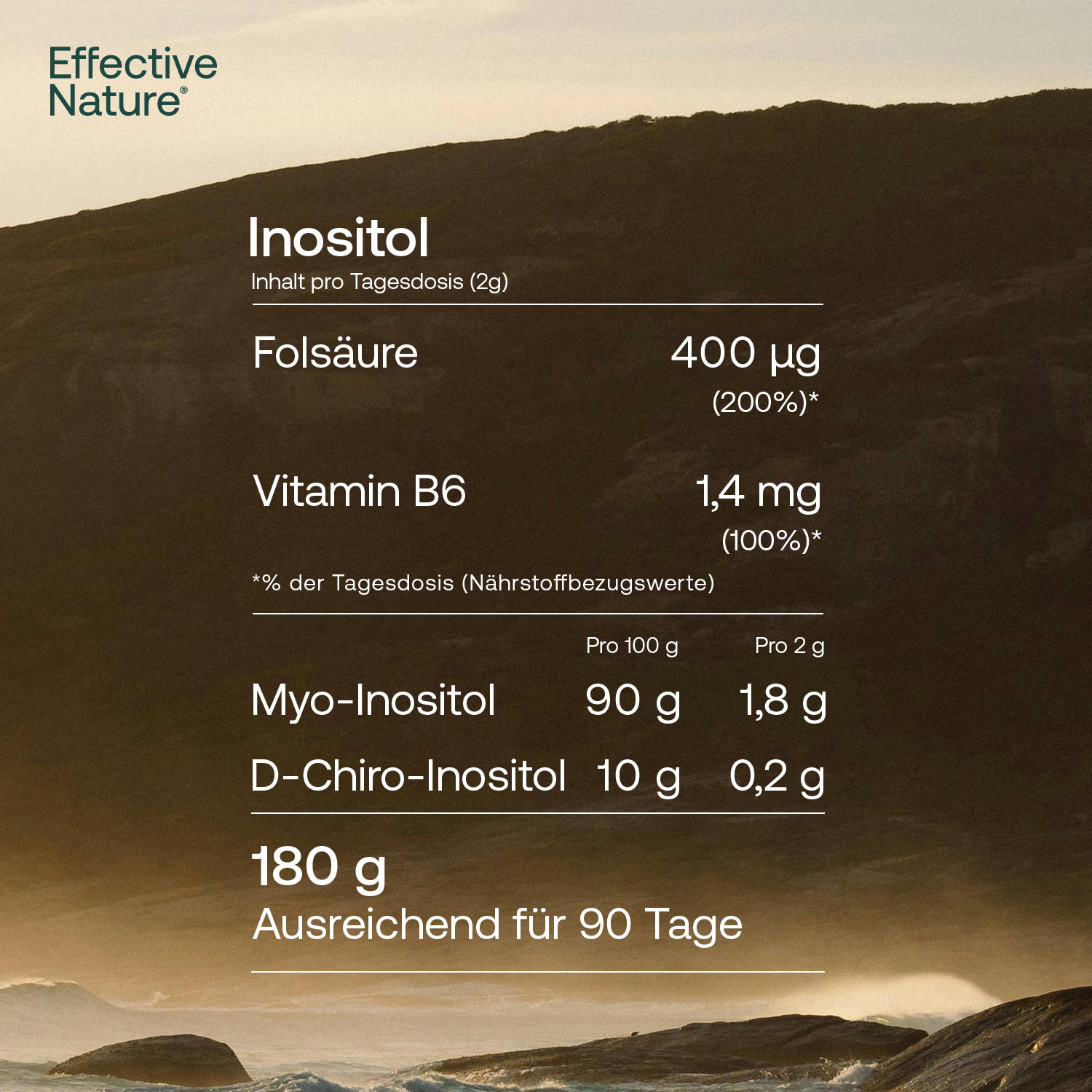 Ein ganz besonderer, natürlicher Botenstoff, der seit einiger Zeit viele Anhängerinnen gefunden hat: Das Inositol von Effective Nature liefert Myo-Inositol und D-Chiro-Inositol im wirksamen Verbund als praktische Kapsel zur problemlosen Einnahme - und deckt zusätzlich den Bedarf an Vitamin B6 und Folsäure.