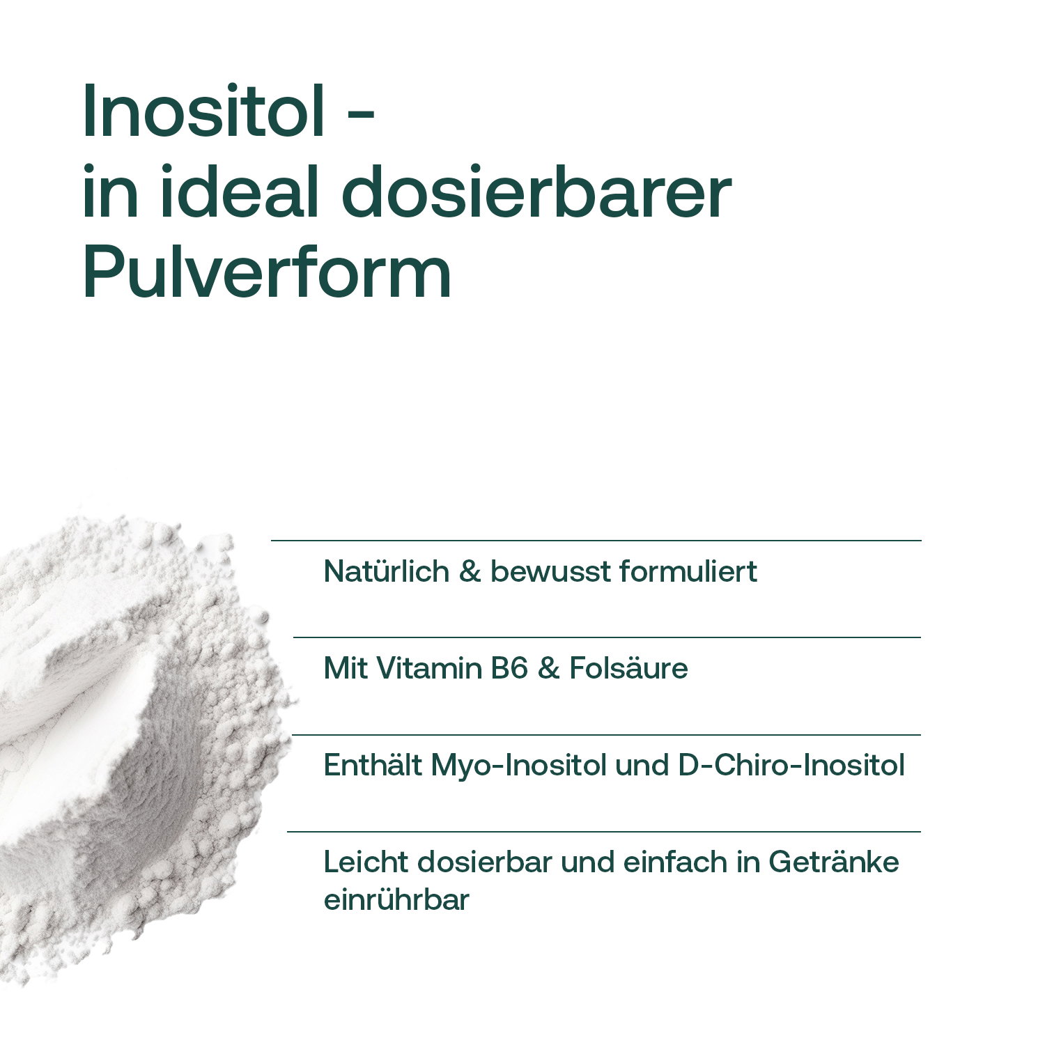 Das Inositol-Pulver kombiniert Myo- und D-Chiro-Inositol mit Folsäure und Vitamin B6 – zwei essenziellen Mikronährstoffen, die besonders für Frauen von Bedeutung sind. Folsäure leistet einen Beitrag zur normalen Blutbildung und unterstützt das Wachstum des mütterlichen Gewebes während der Schwangerschaft. Vitamin B6 trägt zur Regulierung der Hormontätigkeit bei. Eine ergänzende Versorgung mit diesen Stoffen kann in bestimmten Lebensphasen sinnvoll sein. Das Pulver lässt sich flexibel dosieren und unkompliziert in Wasser oder andere Getränke einrühren.