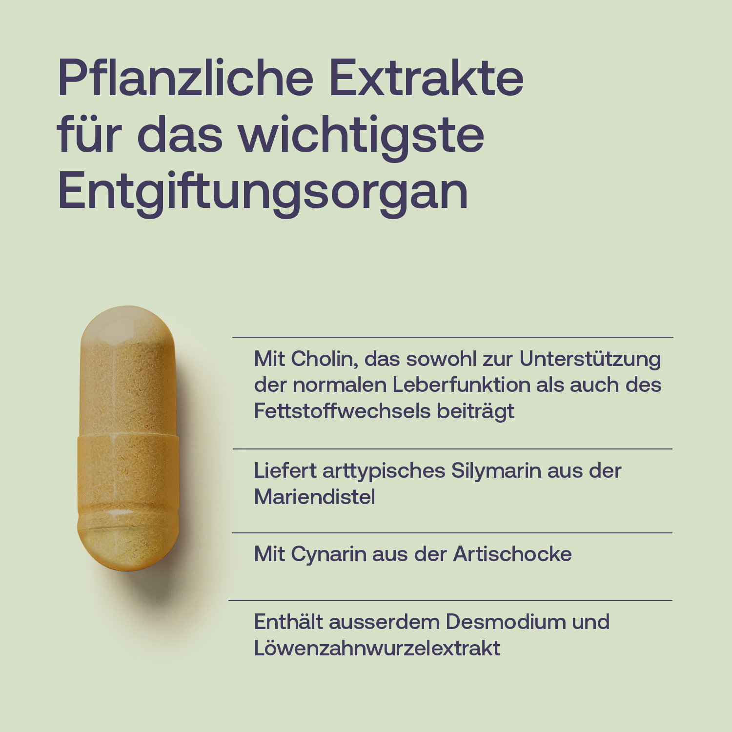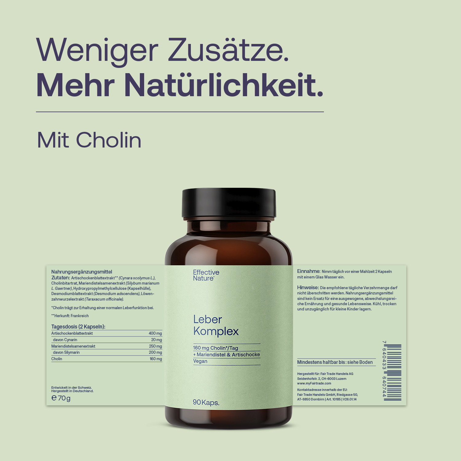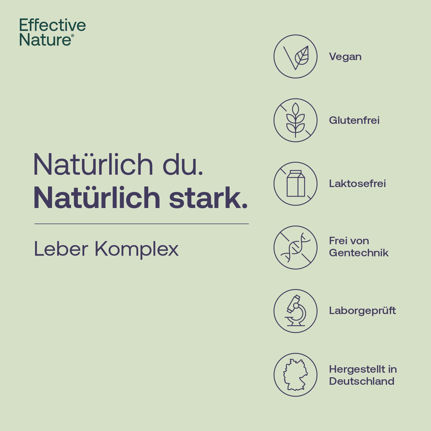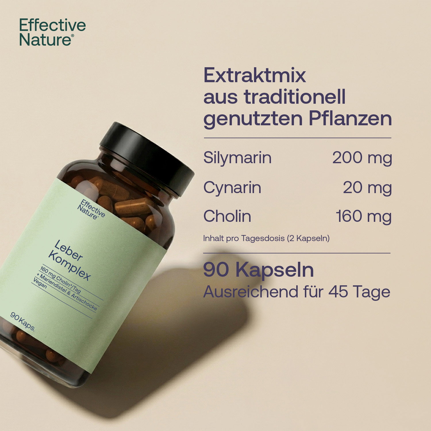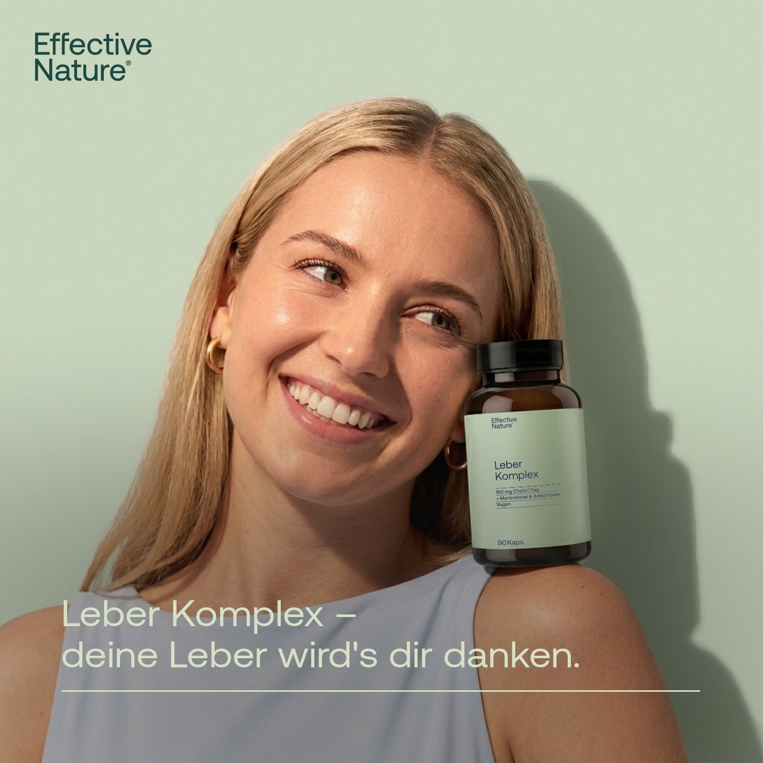 Der Leber Komplex von Effective Nature enthält Artischocke, Löwenzahn, Mariendistel und Desmodium, deren pflanzlichen Inhaltsstoffe seit Jahrhunderten für ihre Vielseitigkeit geschätzt werden. Das ebenfalls enthaltene Cholin ergänzt die vier Pflanzenextrakte ideal, denn es unterstützt unter anderem die normale Leberfunktion und den Fettstoffwechsel.