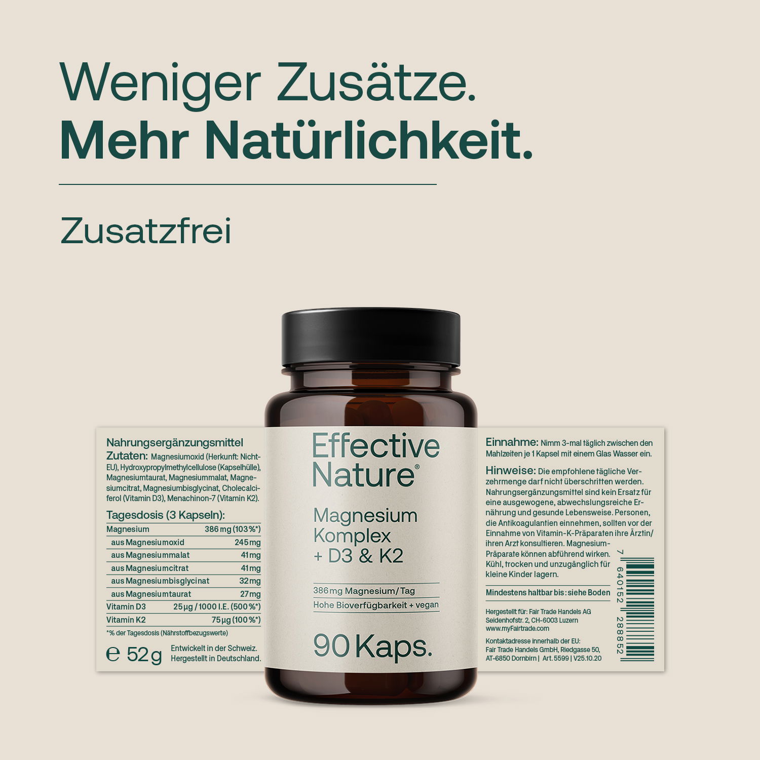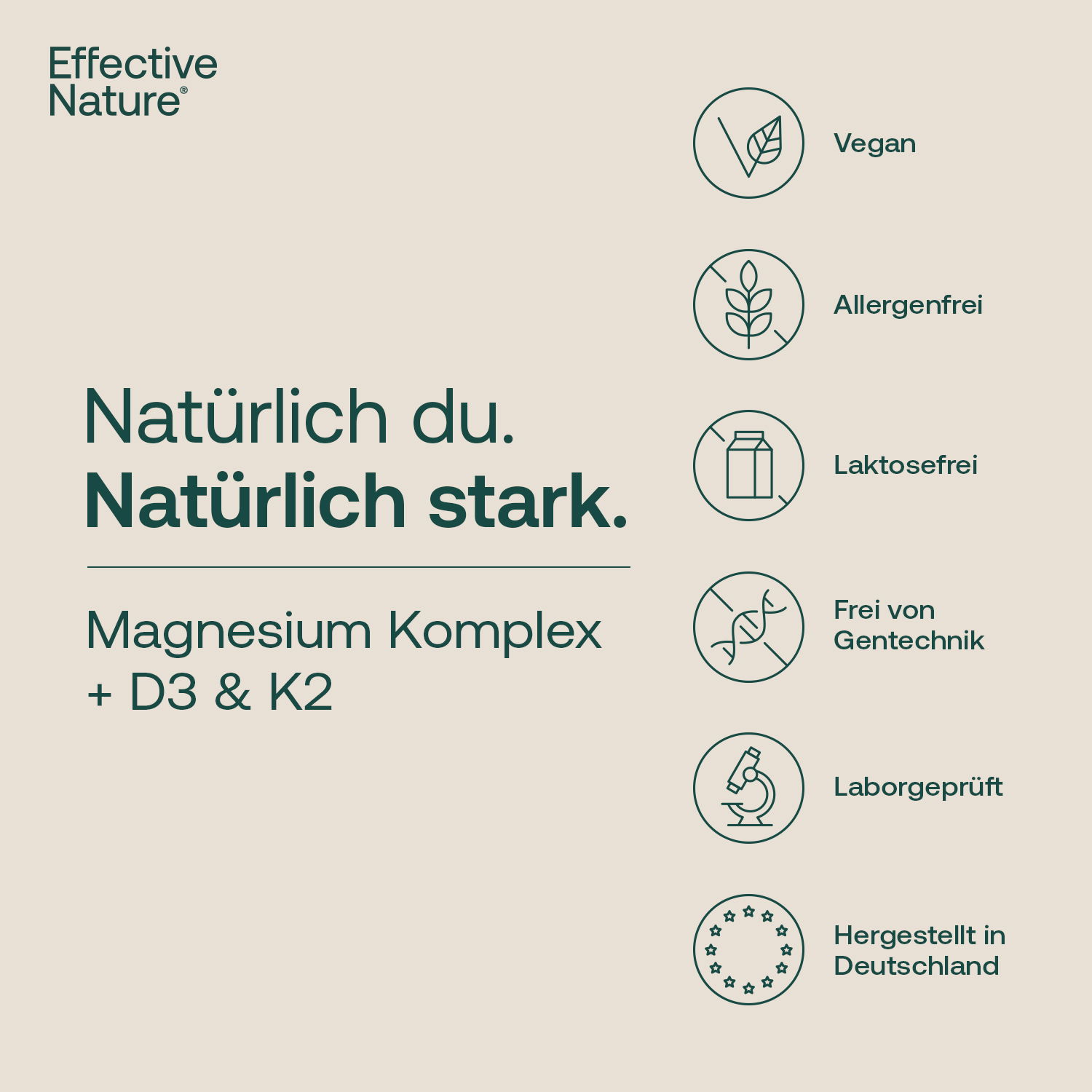 Magnesium gilt unter den Mineralstoffen dank seiner beeindruckenden Vielseitigkeit als echter Allrounder. Durch die optimierte, gut durchdachte Kombination spezialisierter Magnesiumverbindungen ist Magnesium Komplex von effective nature die Magnesiumergänzung der Wahl für all jene, für die Qualität vor Quantität geht. Mit der empfohlenen Verzehrmenge decken Sie Ihren täglichen Bedarf an Magnesium und dem Vitamin K2 zu 100% und führen Ihrem Körper zudem Vitamin D in hohen Mengen (500% desTagesbedarfs) zu. Einfach ideal!