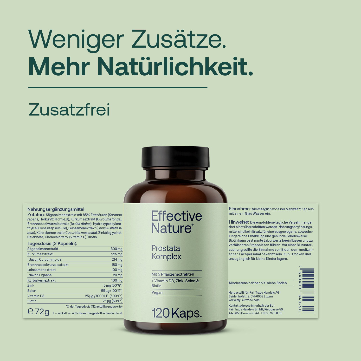 Prostata Komplex lässt keine Männerwünsche mehr offen: Der neue Wirkstoffkomplex von Effective Nature liefert wertvolle Pflanzenextrakte aus der Sägeplame (die reich ist an wertvollen Fettsäuren), der Brennnesselwurzel und aus Kurkuma sowie die wichtigen, hochdosierten Nährstoffe Biotin, Vitamin D, Selen und Zink, die der Gesundheit der unteren Harnwege und einem guten Hormonhaushalt dienen.