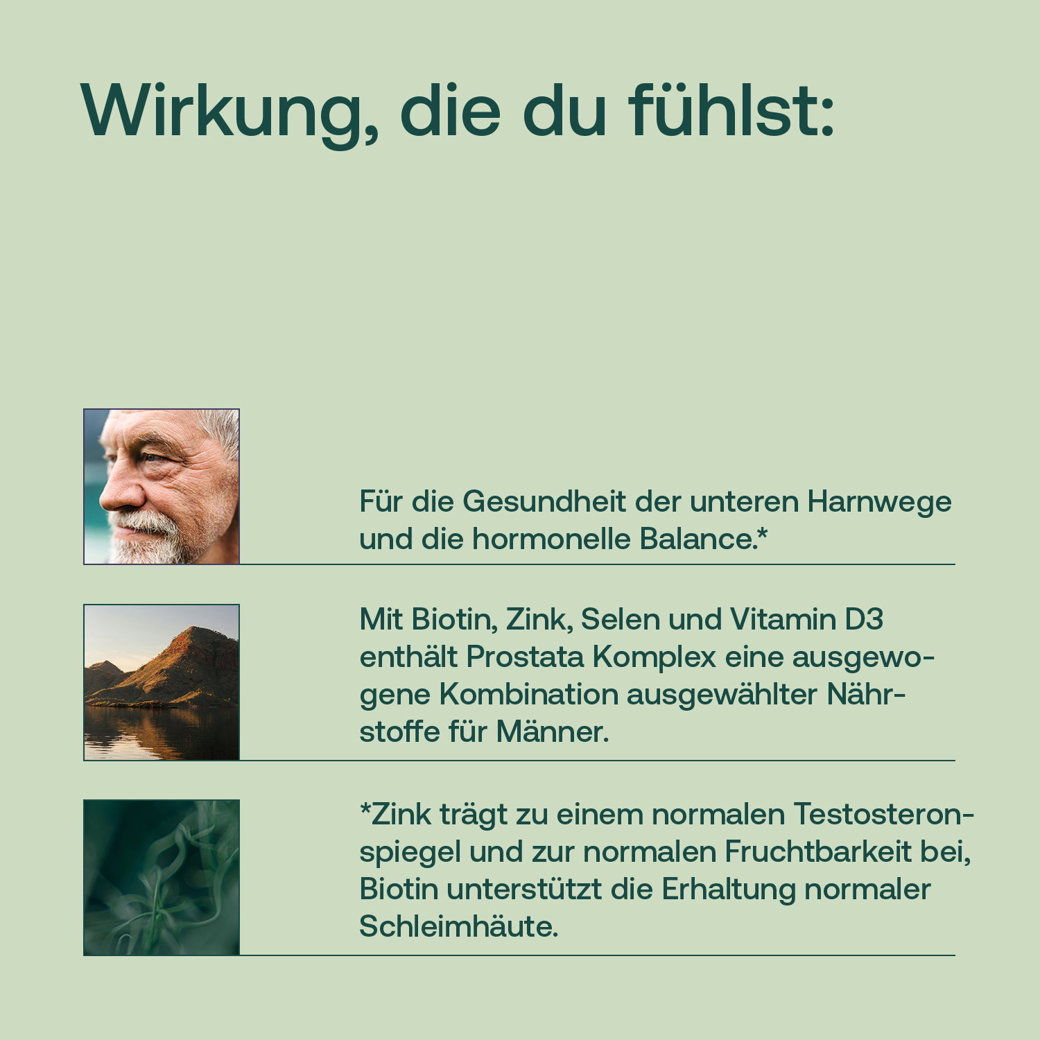 So unterstützt Zink, ein echter Universalnährstoff, beispielsweise den normalen Testosteronspiegel und trägt zur normalen Fruchtbarkeit bei, während Biotin der Erhaltung normaler Schleimhäute und Selen der normalen Spermabildung dienen.