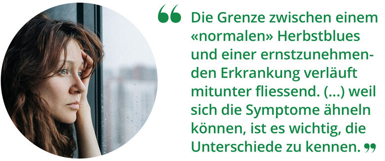 Die Grenze zwischen einem „normalen“ Herbstblues und einer ernstzunehmenden Erkrankung verläuft mitunter fliessend. Gerade weil sich die Symptome ähneln können, ist es wichtig, die Unterschiede zu kennen. Das soll dich nicht verunsichern, sondern dir Sicherheit im Umgang mit deinen Gefühlen geben.