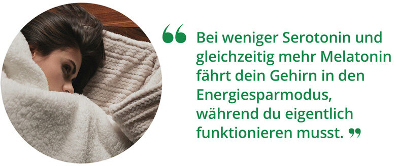 Hier wird es biochemisch spannend und es wird erklärt, warum du dich nicht einfach „zusammenreissen” kannst. Das Tückische daran ist: Bei weniger Serotonin und gleichzeitig mehr Melatonin fährt dein Gehirn in den Energiesparmodus, während du eigentlich funktionieren musst. Es ist, als würde jemand gleichzeitig auf Bremse und Gas treten.