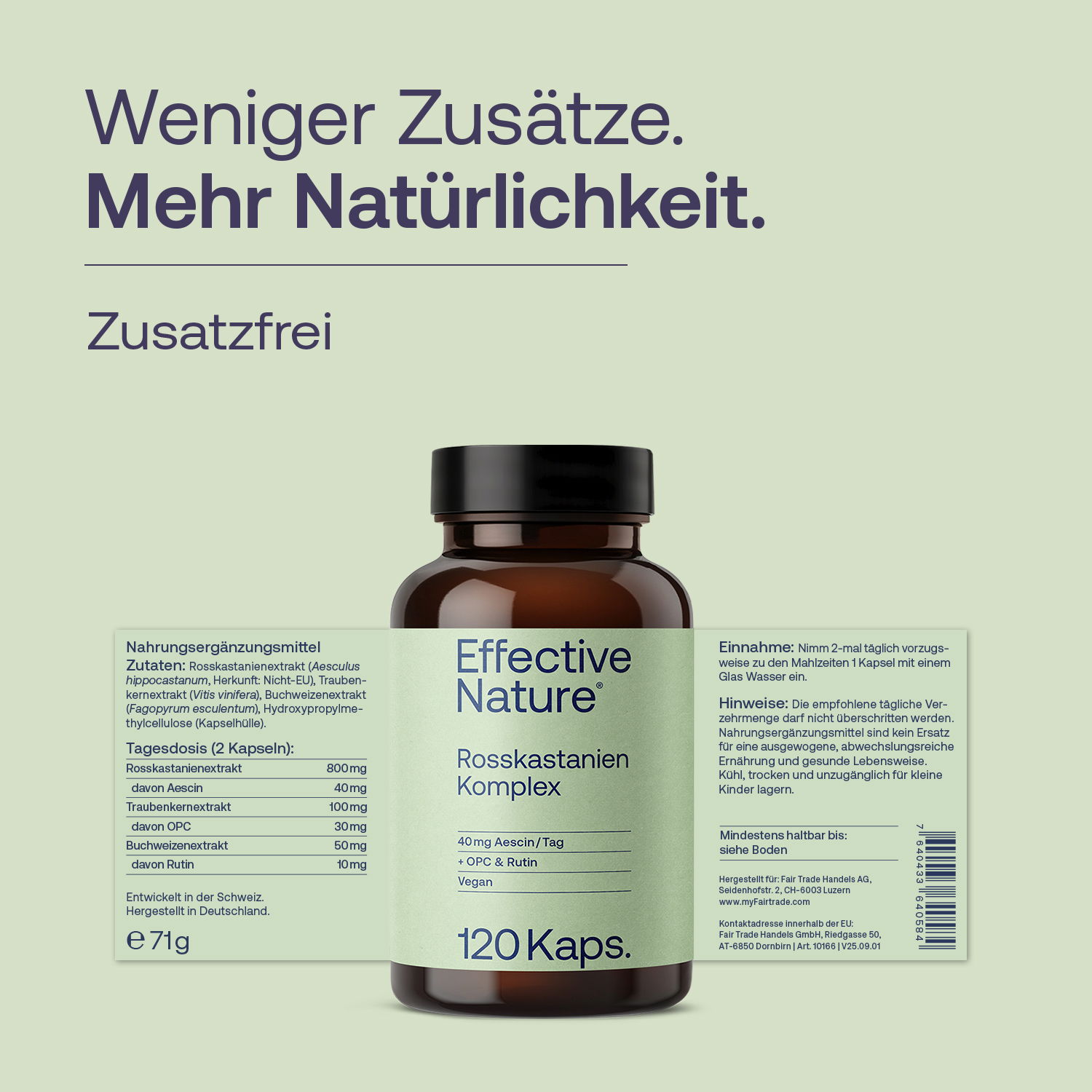 Im Rosskastanien-Komplex von Effective Nature trifft dieser traditionell genutzte Baum (bzw. der Extrakt seiner Samen) auf zwei weitere nicht weniger beeindruckende Pflanzenextrakte: Einerseits OPC, das aus den Kernen dunkler Trauben gewonnen wird, und andererseits das etwas unbekanntere Rutin, an dem der eher unscheinbare Buchweizen besonders reich ist. Drei spezielle Pflanzen, drei spezielle Aktivstoffe – und eine Formel, die das beste aus allen drei Welten auf optimale Weise vereint.