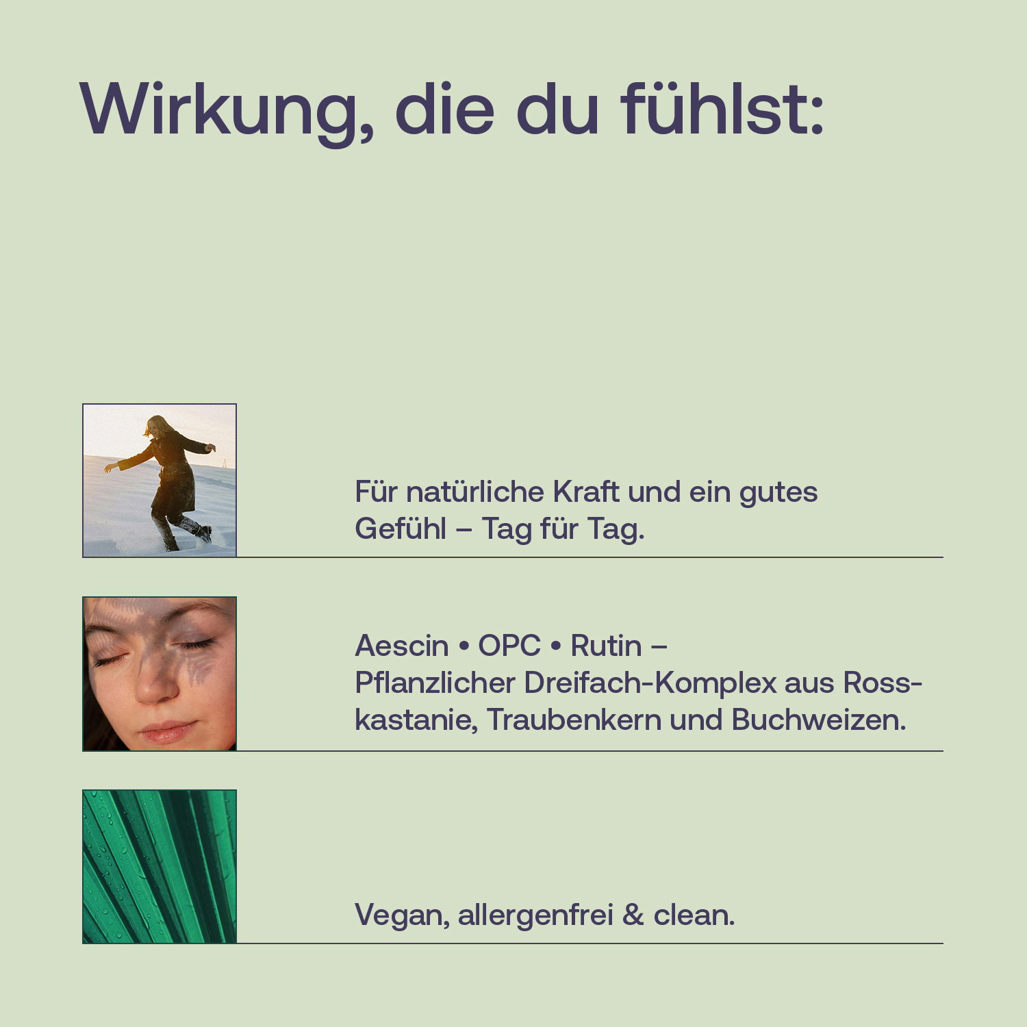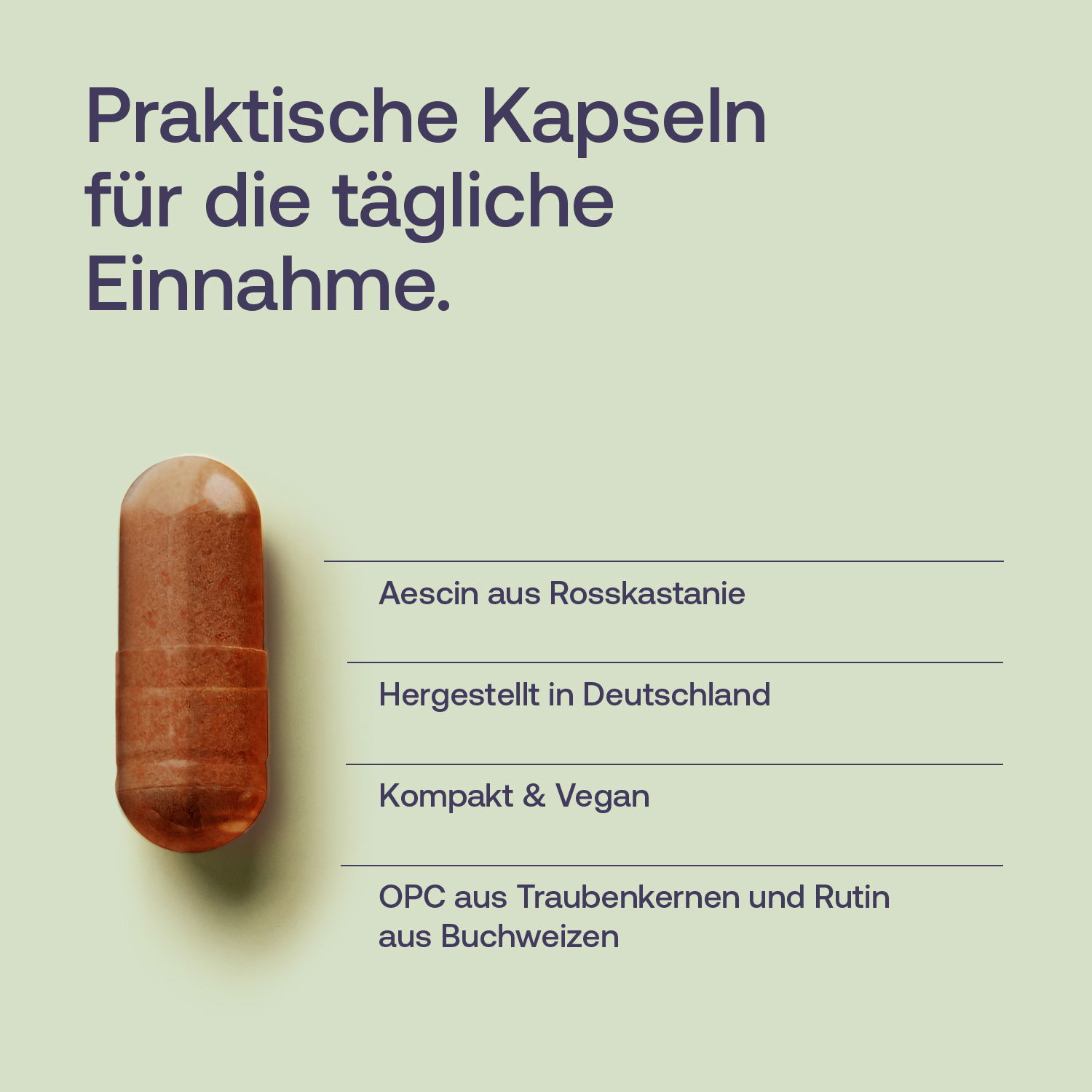 Rosskastanienextrakt (Aesculus hippocastanum, Herkunft: Nicht-EU), Traubenkernextrakt (Vitis vinifera), Buchweizenextrakt (Fagopyrum esculentum), Hydroxypropylmethylcellulose (Kapselhülle).