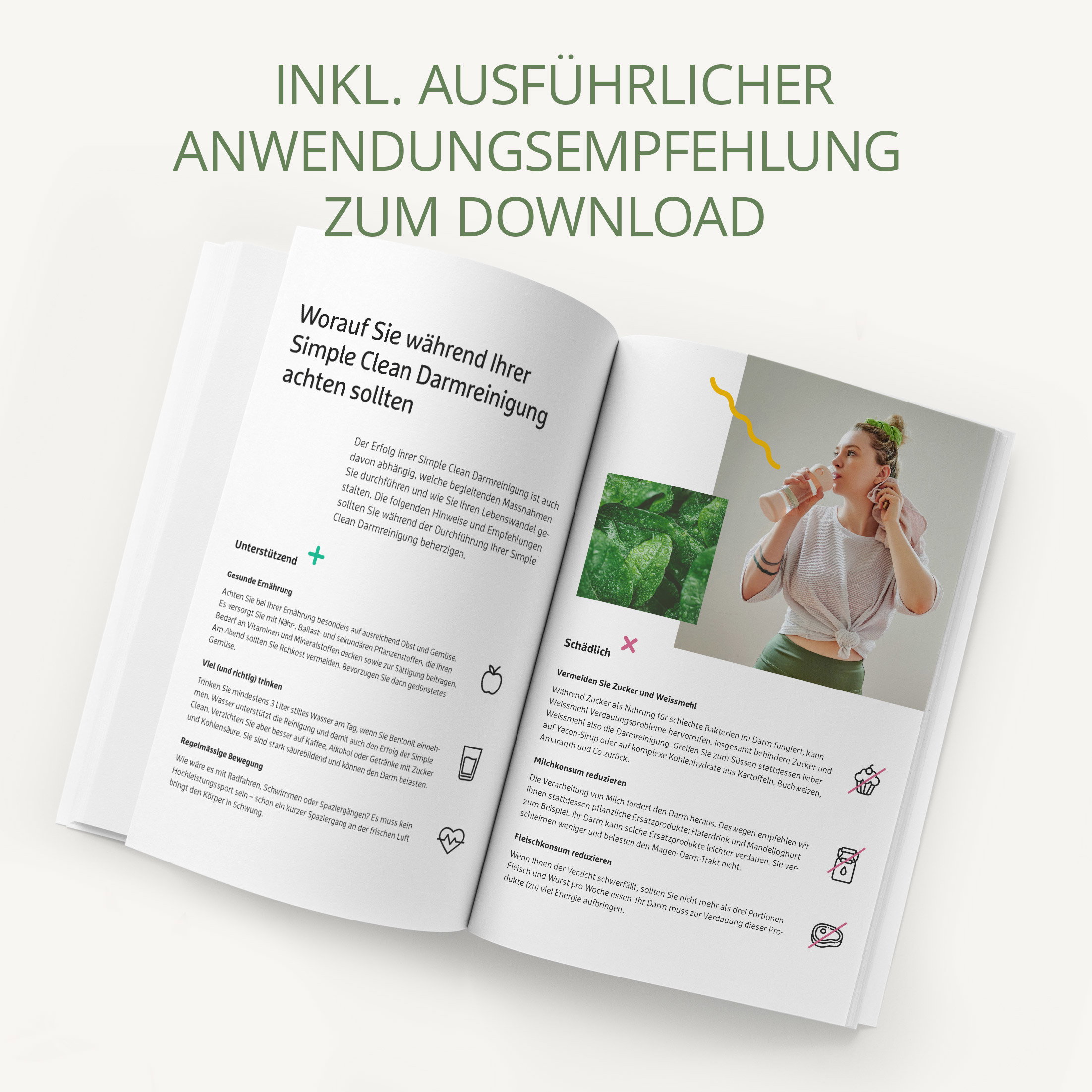 Zusätzlich zu den drei hochwertigen Produkten von effective nature erhalten Sie eine illustrierte, umfangreiche Broschüre mit vielen Tipps und Ratschlägen sowie der detaillierten Anwendungsempfehlung zu Ihrer Darmreinigung. Für den ganzheitlichen Erfolg können Sie die Darmreinigung optional mit unseren Tipps und Ratschlägen aus der Anwendungsempfehlung ergänzen: Gesundes Essen, genug Wasser & Schlaf, kein Zucker und kein Alkohol - für das allgemeine Wohlbefinden!