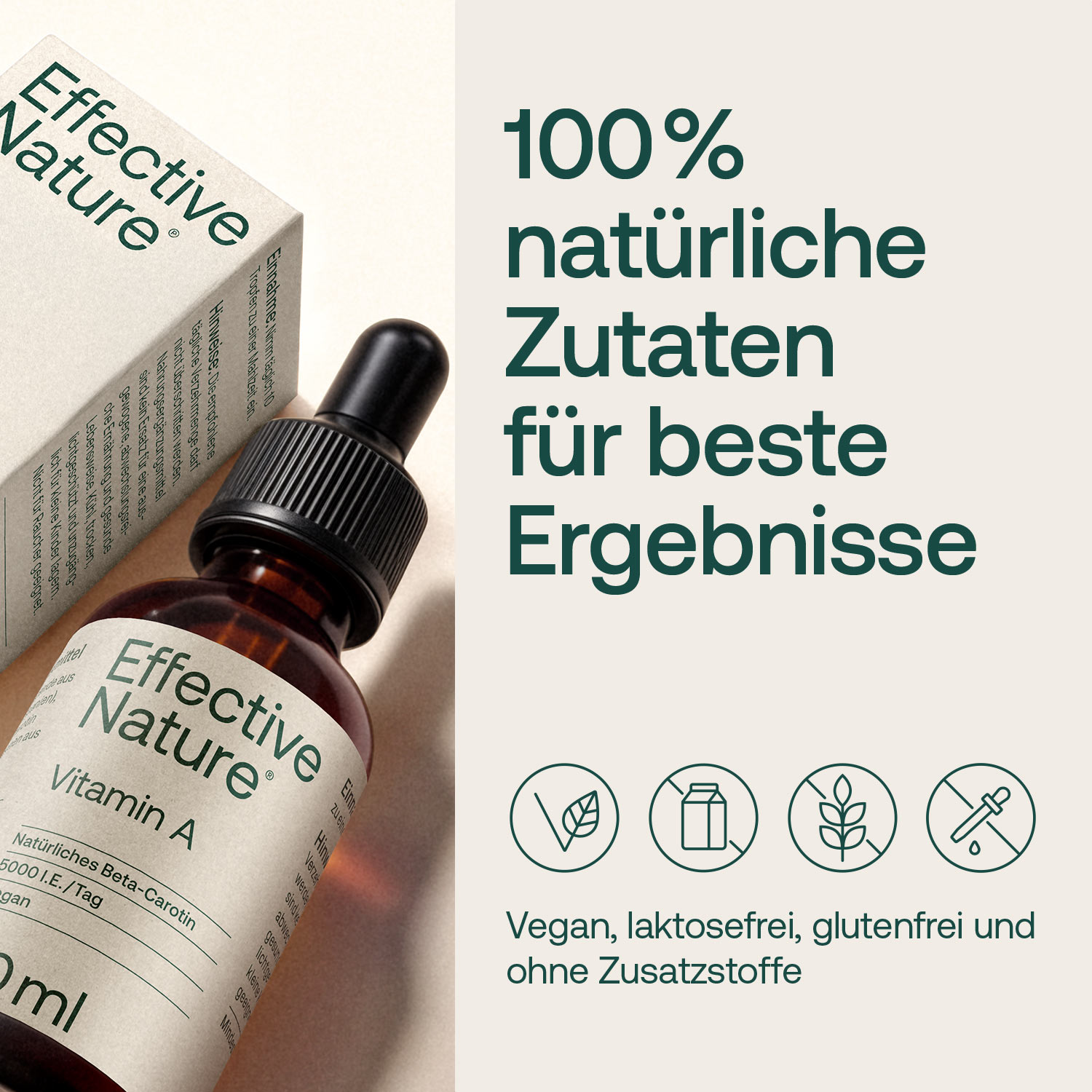 Vitamin A selbst kann nur aus tierischen Quellen, beispielsweise Leber, gewonnen werden. Von pflanzlicher Herkunft ist hingegen immer das Provitamin A, das auch als Beta-Carotin bekannt ist. Für die Vitamin-A-Tropfen von effective nature wurde auf ein innovatives Gewinnungsverfahren gesetzt - der Wirkstoff stammt hier aus dem fermentierten Pilz Blakeslea Trispora. Somit sind diese Tropfen rein vegan.