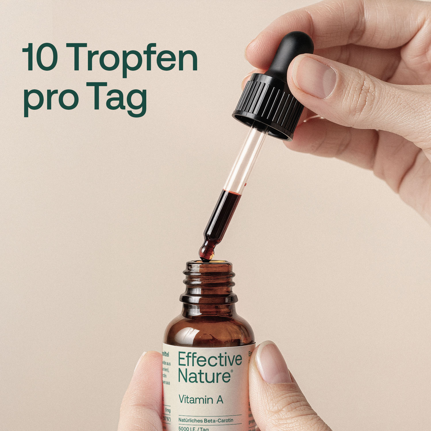 Vitamin A bzw. dessen Vorstufe, das bekannte Beta-Carotin - auch Provitamin A genannt -, ist bei vielen Menschen vor allem als "das Augenvitamin" geläufig. Kein Wunder, spielt Retinol (so der wissenschaftliche Name des Vitamin A) unter anderem eine wichtige Rolle beim Erhalt der normalen Sehkraft! Vitamin A findet sich ausschliesslich in tierischen Produkten (allen voran Leber, aber auch Butter, Eigelb und Milch), während das Beta-Carotin, das der Körper in das Vitamin A umwandelt, sich in pflanzlichen Lebensmitteln befindet. Die Vitamin-A-Tropfen von effective nature versorgen Sie pro Tagesdosis mit 9 mg Beta-Carotin, was 1500 μg Vitamin A, also 5000 internationalen Einheiten (I.E.) entspricht. Somit decken Sie 187% des täglichen Bedarfs an Vitamin A mit nur 10 Tropfen - vegan und natürlich!