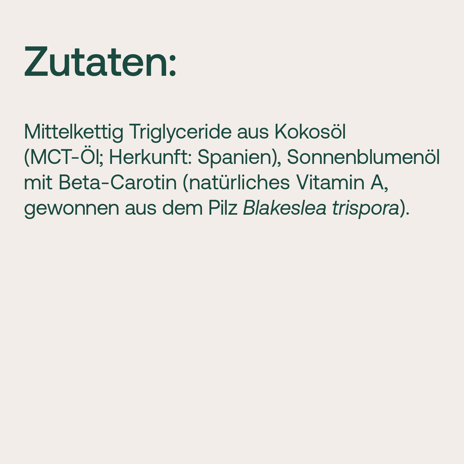 Mittelkettige Triglyceride aus Kokos (MCT-Öl; Herkunft: Spanien), Sonnenblumenöl mit Beta-Carotin. Dieses natürliche Vitamin A wird aus dem Pilz Blakeslea trispora gewonnen.